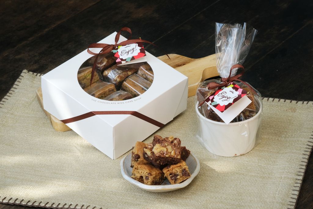 Chewy cookie bars in two flavors: Chocolate Chip Bars and Fudge Walnut Brownies. Comes in Box of 16 pieces or Goodie Cups (10 pieces/cup, order by dozen cups).